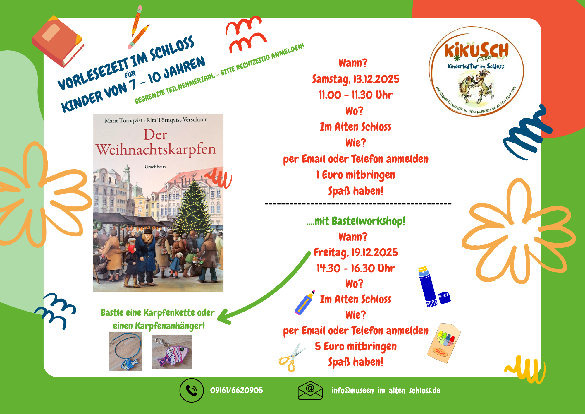 Kommt zum Zuhören in unser schönes Schloss und erlebt in unseren mittelalterlichen Mauern das Bilderbuch „Der Weihnachtskarpfen“ von Marit Törnquist und Rita Törnquist-Verschuur. Danach wird auch noch eine Karpfenkette oder einen Karpfenanhänger gebastelt. Kommt am Freitag, den 19.12. von 14.30 Uhr bis 16.30 Uhr ins Alte Schloss, bringt 5 Euro mit und stimmt euch damit schon auf die Weihnachtsferien ein!