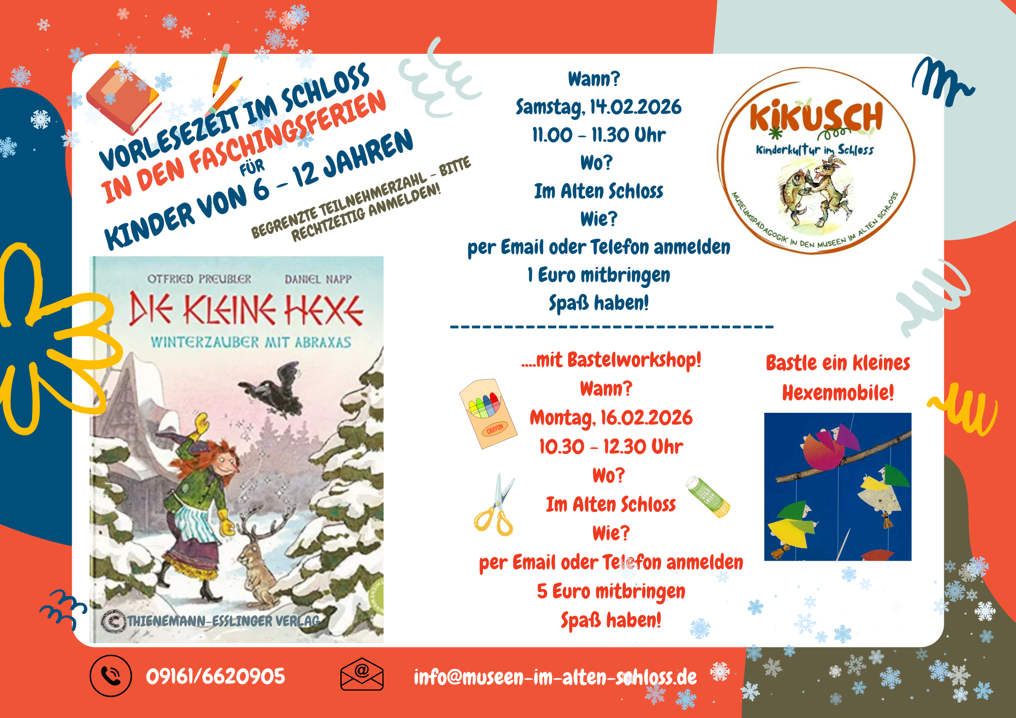 Unsere Vorlesezeit findet am Samstag, 14. Februar 2026 von 11.00 - 11.30 Uhr statt. Wer zusätzlich auch ein kleines Hexenmobile basteln will, wird bitte zum 2. Vorlesetermin am Montag, 16. Februar 2026 von 10.30 - 12.30 Uhr angemeldet. Kinderschere und Klebestift mitbringen! Bitte beachten: Die Kinder müssen angemeldet werden, und wir benötigen Ihre Emailadresse und eine Handynummer eines verantwortlichen Erwachsenen.