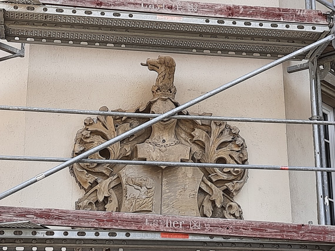 ... durch den Schlosshof und weiter in den Schulhof. Findet ihr dort am Neuen Schloss das große Steinwappen, das leider im Moment vom Baugerüst verdeckt ist?