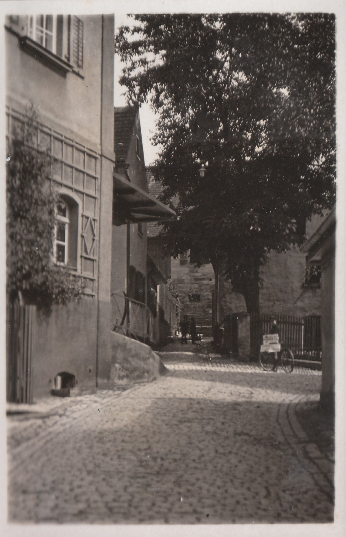 ... über den Montespertoli-Platz links vorbei an der E-Bikestation und geradeaus weiter. Lauft jetzt die Gasse hinter der Sparkasse hinauf. Erkennt ihr das Haus Schmiedegasse 2? Es ist das Haus links an der Ecke und sieht heute immer noch ganz ähnlich auswie auf dem alten Foto.