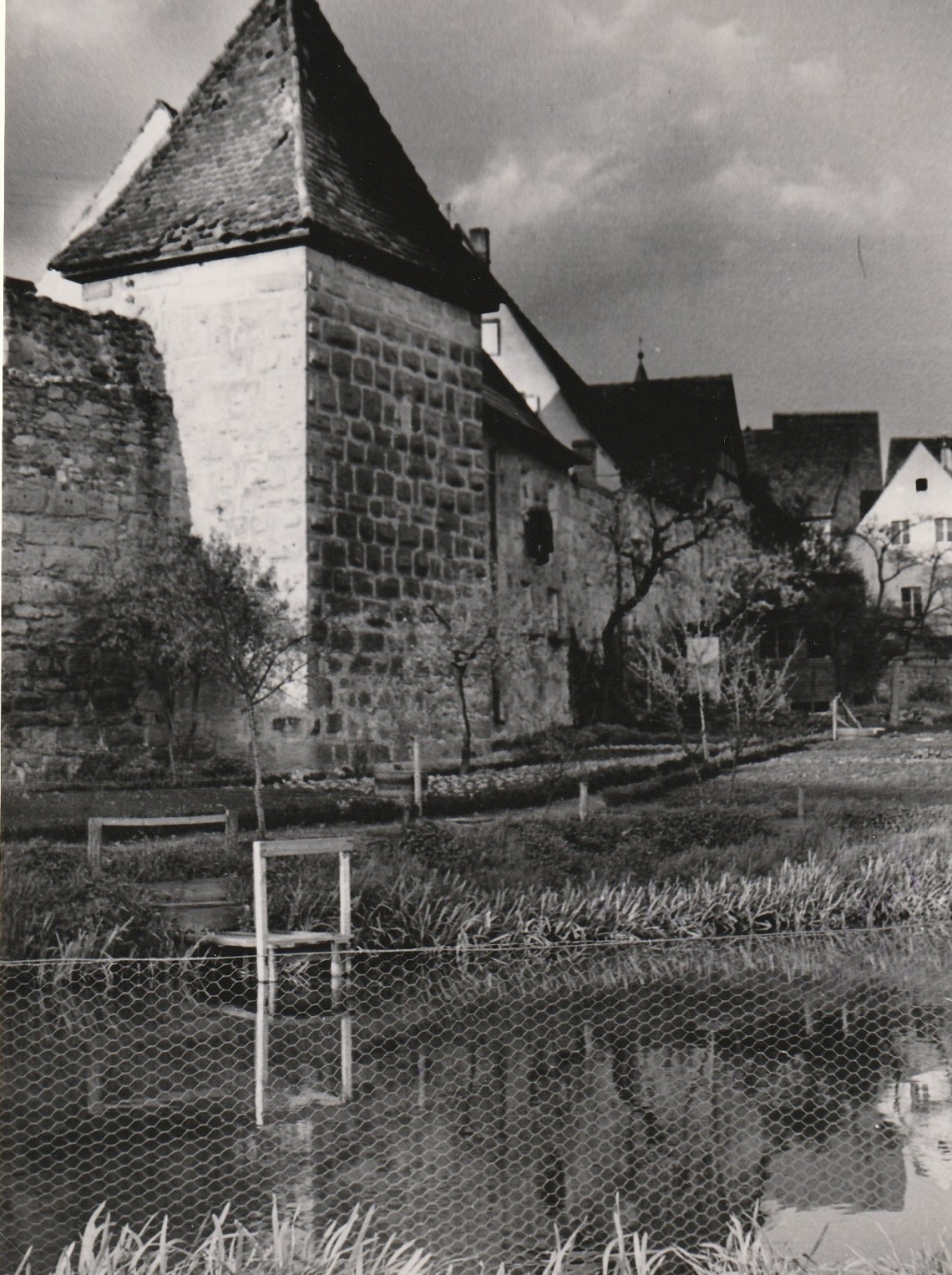 Jetzt geht ihr weiter, bis ihr links zwischen zwei Häusern einen Fußweg seht. Er ist mit einem blauen Fußgängerweg Schild gekennzeichnet. Hier folgt ihr dem äußeren Stadtmauerweg bergab, bis ihr diesen Turm entdeckt. Gut aufpassen, enn heute sieht es dort ein kleines bisschen anders aus, aber ihr findet ihn bestimmt! Ihr müsst dazu immer wieder zwischen den Büschen und Bäumen hindurchschauen.