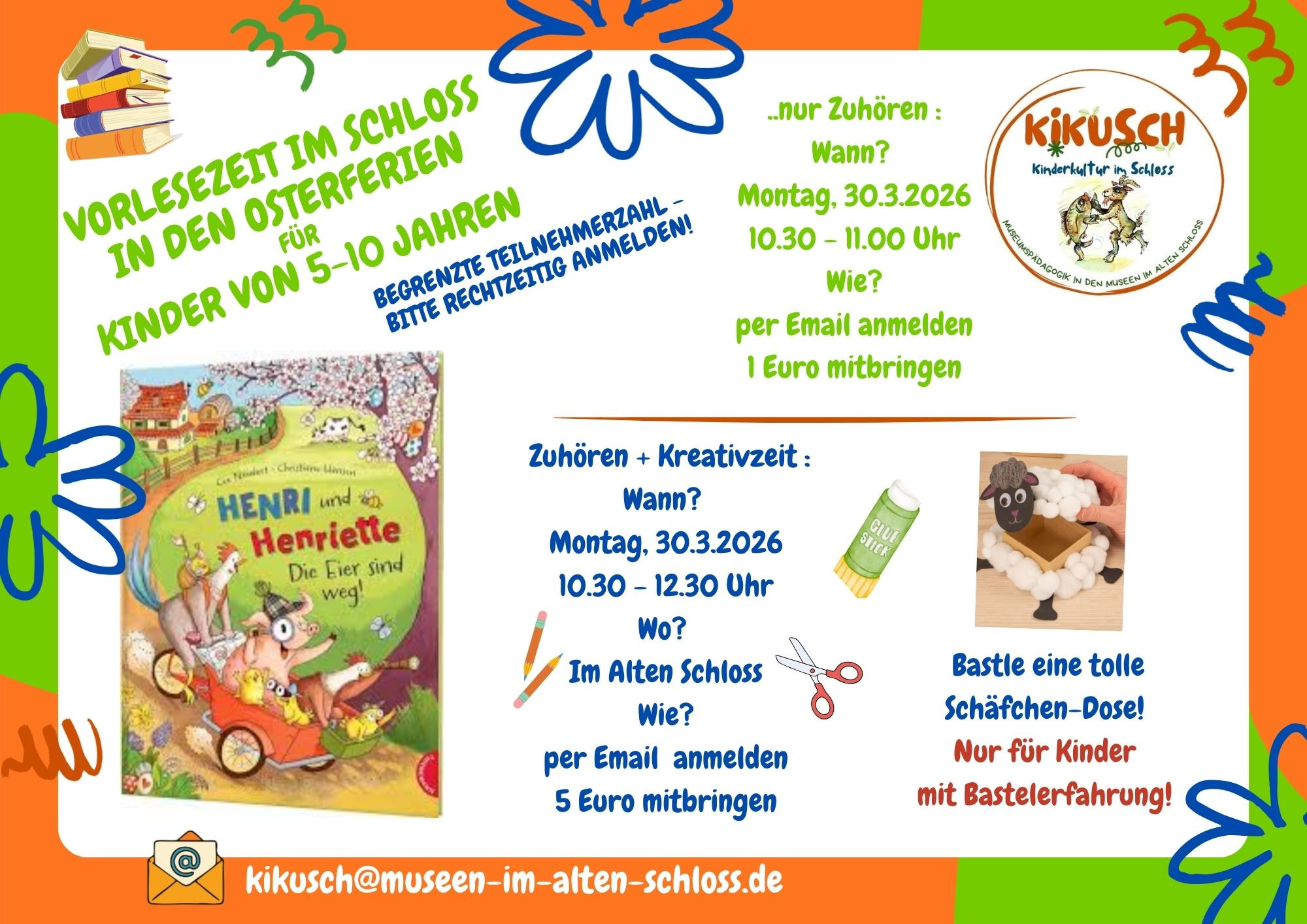 Liebe Eltern, melden Sie Ihr Kind unter kikusch@museen-im-alten-schloss.de doch zur Vorlesezeit zu Beginn der Osterferien an! Sie findet am Montag, 30.03.2026 ab 10:30 Uhr im Alten Schloss statt. Bitte geben Sie in der Email unbedingt das Alter und den Namen Ihres Kindes und Ihre Handynummer an.