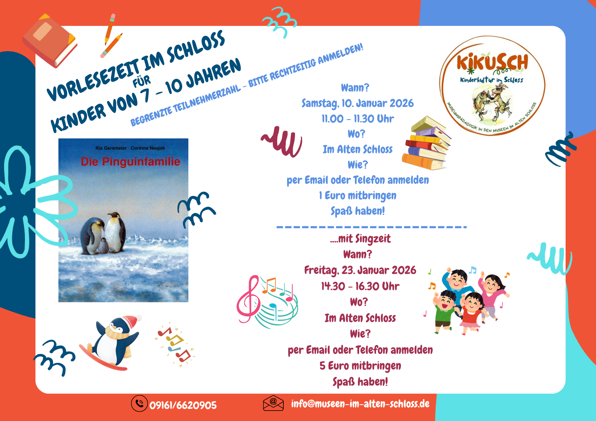 Wenn ihr gerne singt und zum Bilderbuch auch ein Pinguinlied lernen und musizieren möchtet, dann kommt lieber am Freitag, den 23. Januar 2026 von 14:30 Uhr bis 16:30 Uhr. Hier bringt ihr 5 Euro mit und dürft zwei schöne Stunden mit Buch und Musik verbringen.