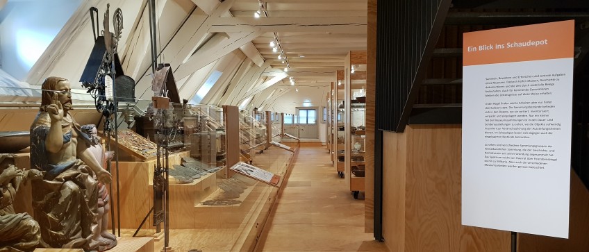 Das Schaudepot klärt aber auch über Museumsarbeit auf. Die Besucher können die zentralen Aufgaben und Arbeiten eines Museums kennen lernen und erhalten so einen Blick hinter die Kulissen. Wer will kann sogar selbst in die Rolle eines Museumsmitarbeiters schlüpfen und an einer Mitmach-Station bestimmte Sammlungsobjekte eigenhändig inventarisieren. Die Objekte warten darauf betitelt, beschrieben, vermessen und mit einer Inventarnummer versehen zu werden. Leere Hängeetiketten und Karteikarten liegen bereit, letztere können anschließend mit nach Hause genommen werden. Auf diese Weise wird das Museum als Ort des Sammelns und Bewahrens nicht nur sichtbar, sondern auch erlebbar.